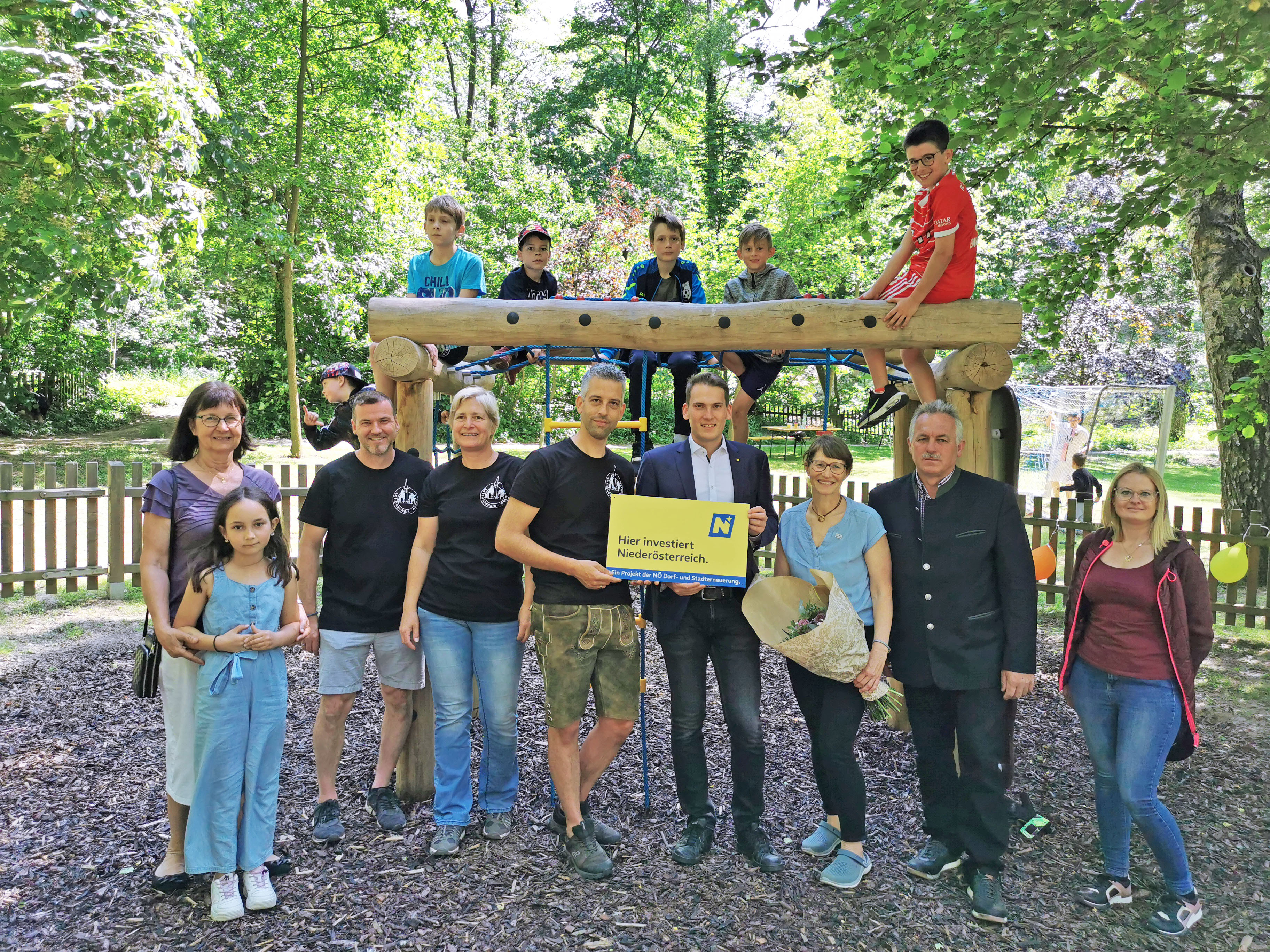 v.l.n.r.: Vizebürgermeisterin Anneliese Nebenführ mit Enkelin, Andreas Böck (Aktionskreis Würnitz), Martha Kasess (Aktionskreis Würnitz), Sebastian Philipp (Aktionskreis Würnitz), Bürgermeister Alexander Raicher, DI Andrea Haberkorn (NÖ.Regional), Ortsvorsteher Josef Wannerer und Veronika Mossbeck bei einem neuen Spielgerät im Kinderspielplatz (c) NÖ.Regional/Haberkorn